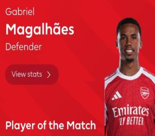 最終經(jīng)過英超官網(wǎng)球迷投票,加布里埃爾以33%的得票率力壓哲凱賴什(32%)當(dāng)選全場最佳球員。