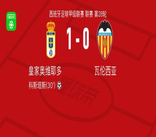 北京時間3月15日西班牙足球甲級聯(lián)賽 聯(lián)賽 第28輪,皇家奧維耶多主場對陣瓦倫西亞?;始見W維耶多科斯塔斯破門。最終比分皇家奧維耶多 1-0 瓦倫西亞。