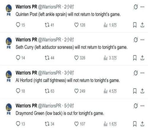 第二節(jié),小庫里比賽中意外受傷,隨即獨(dú)自返回更衣室,隨后勇士官他因左內(nèi)收肌酸痛將不會參加今晚的比賽