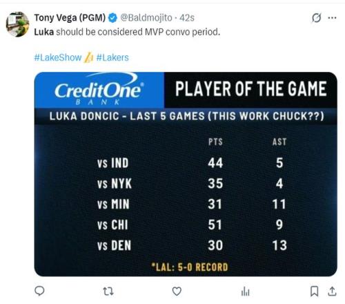 湖人媒體曬出東契奇最近幾場(chǎng)比賽的數(shù)據(jù)力挺他應(yīng)該進(jìn)入MVP討論。