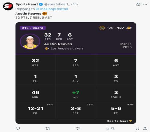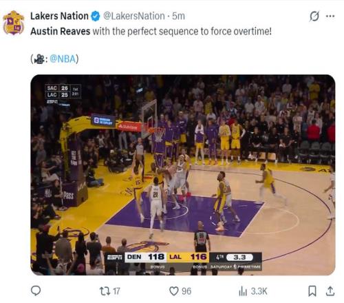 湖人官方也盛贊里夫斯幫助球隊拖入了加時賽。