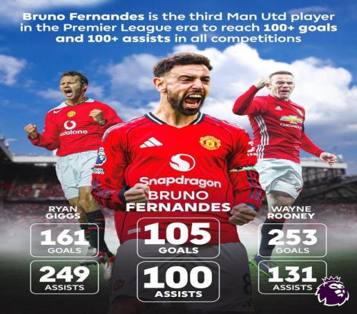 據(jù)統(tǒng)計(jì),布魯諾-費(fèi)爾南德斯成為英超時(shí)代第三位各項(xiàng)賽事進(jìn)球和助攻數(shù)均達(dá)到100的曼聯(lián)球員,前兩位分別是吉格斯(161球249助)和魯尼(253球131助)。