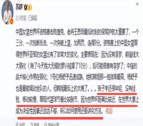 10分鐘只得4分,怎么信任她?有時單場失誤5次,殺敵一千,自損八百,也難以信任她??傊K群是不看好張子宇在世界杯的表現(xiàn)。不知大家有沒有認(rèn)同蘇群的看法。