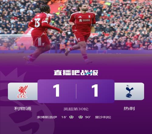 利物浦升至第五,熱刺結(jié)束各項賽事6連敗,領(lǐng)先降級區(qū)1分;索博任意球破門,里沙利松絕平。