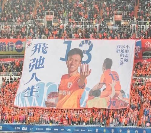 在張弛的退役儀式上,濟南奧體中心看臺展示巨幅TIFO:“飛弛人生。致敬永遠的13號‘小將’張弛?!?/p>