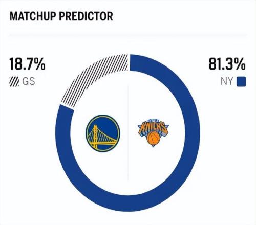 賽前,美媒ESPN對(duì)本場(chǎng)比賽進(jìn)行了勝率預(yù)測(cè),尼克斯隊(duì)勝率高達(dá)81.3% ,勇士勝率則僅有18.7% ,差距非常明顯。