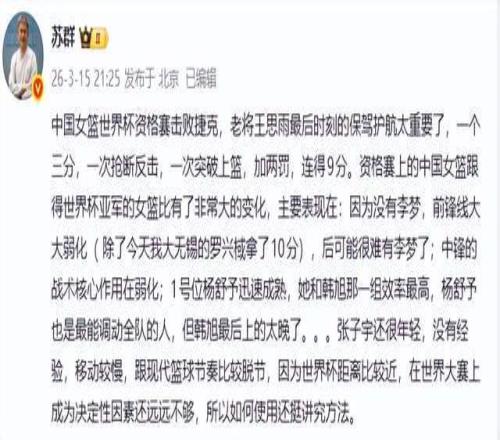 本次世預(yù)賽,中國(guó)女籃的外線(xiàn)表現(xiàn)難以讓人滿(mǎn)意,對(duì)陣捷克隊(duì)一役,全隊(duì)三分球21投僅6中,命中率低至28.6%。名嘴蘇群直言,如今的中國(guó)女籃與2022年世界杯亞軍陣容相比,最大的變化就是缺少了李夢(mèng),前鋒線(xiàn)實(shí)力大幅弱化。李夢(mèng)作為曾經(jīng)的鋒線(xiàn)核心,擁有出色的持球突破和外線(xiàn)投射能力,在2022年世界杯、2023年亞洲杯等大賽中屢建奇功,她的存在能為球隊(duì)提供穩(wěn)定的外線(xiàn)火力,還能通過(guò)突破牽扯對(duì)手防守,為內(nèi)線(xiàn)創(chuàng)造更多進(jìn)攻空間。沒(méi)有李夢(mèng)的牽制,中國(guó)女籃的內(nèi)線(xiàn)優(yōu)勢(shì)也難以充分發(fā)揮,李月汝、韓旭等內(nèi)線(xiàn)球員常常陷入對(duì)手的包夾之中,難以輕松接球得分。