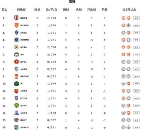 中超積分榜:成都蓉城領(lǐng)跑,兩隊積分“清零”