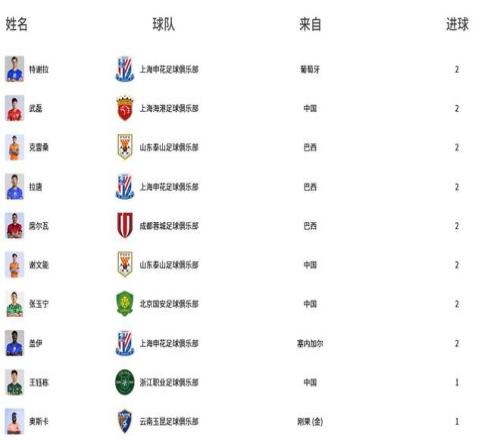 根據(jù)中超官網(wǎng)數(shù)據(jù),兩輪比賽過后,積分榜前十名中前八位球員均打入兩球,競爭異常激烈。其中,泰山隊成為最大亮點,克雷桑以及謝文能憑借在本輪比賽中的出色發(fā)揮成功上榜。