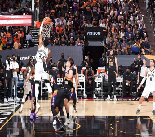 字母哥外線持球,沖擊步行者內(nèi)線,兩人對抗之后,字母哥轉(zhuǎn)身加速擠進禁區(qū),隨后就是一記隔扣。
