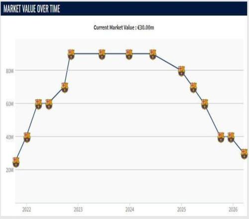 加維的巔峰身價(jià)是2022年11月到2024年6月的9000萬(wàn)歐元,但由于23-24賽季開(kāi)始遭遇傷病問(wèn)題,他的身價(jià)開(kāi)始下跌,本賽季他同樣受到了傷病的影響,因此身價(jià)下跌到了3000萬(wàn)歐元,僅為巔峰身價(jià)的1/3。