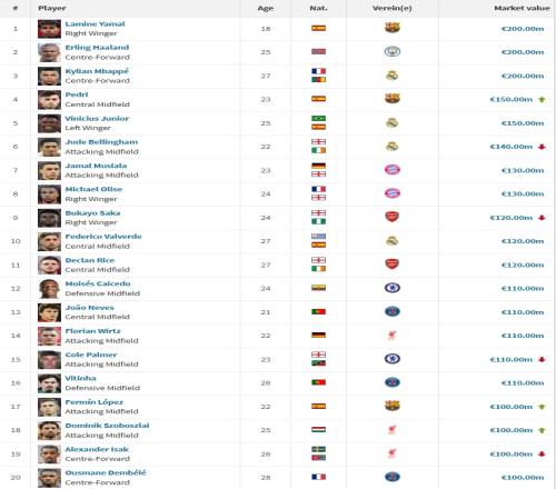 足壇20位億元先生:費(fèi)爾明新晉亞哈姆2億英超8人西甲7人意甲0人