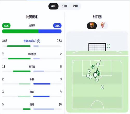 從巴薩5比2擊敗塞維利亞的比賽看,預期進球上巴薩3.66比0.83占據絕對優(yōu)勢,絕佳得分機會是7比2。