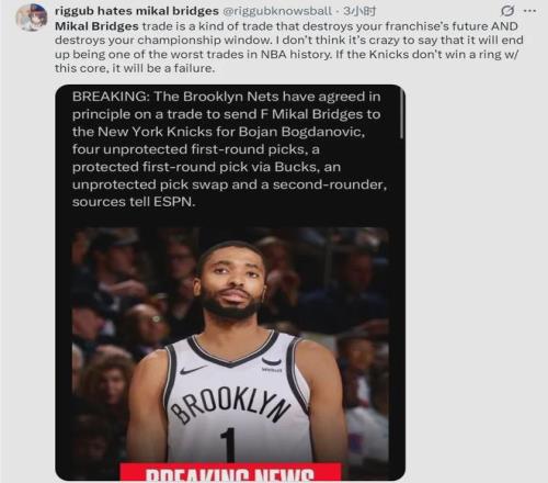 今天有尼克斯球迷在網(wǎng)上開噴:“布里奇斯的交易不僅會(huì)毀掉球隊(duì)的未來(lái),還會(huì)徹底斷送球隊(duì)的奪冠窗口期。毫不夸張地說(shuō),如果尼克斯最終沒能用這套核心陣容贏得總冠軍,當(dāng)初那筆交易最終會(huì)成為NBA歷史上最糟糕的交易之一?!?/p>