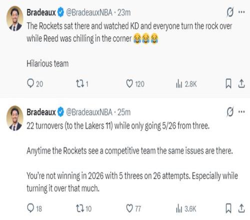 火記:火箭球員們就站在那里看著杜蘭特一頓運(yùn)球,謝潑德則蹲在底角,這真是喜劇的一幕?;鸺霈F(xiàn)22次失誤湖人才11次,火箭隊(duì)三分26中5,每當(dāng)火箭遇上富有競(jìng)爭(zhēng)力的對(duì)手就會(huì)出現(xiàn)相同的問(wèn)題。在2026年這樣的表現(xiàn)是無(wú)法贏球的。