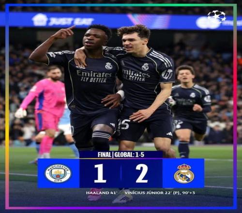 哈蘭德半場扳平,補時階段維尼修斯包抄梅開二度,皇馬2-1客場取勝,總比分5-1強勢晉級,歐冠之王再度壓制英超新貴。