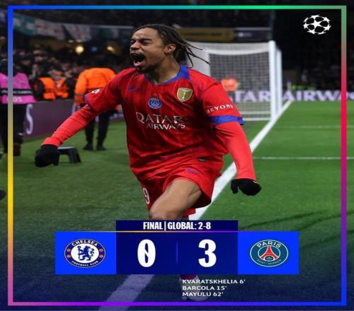 切爾西次回合回到主場,0-3不敵巴黎再次遭遇慘敗??送呃暮绽麃?、巴爾科拉、馬尤盧各入一球,巴黎兩回合總比分8-2橫掃輕松挺進八強。