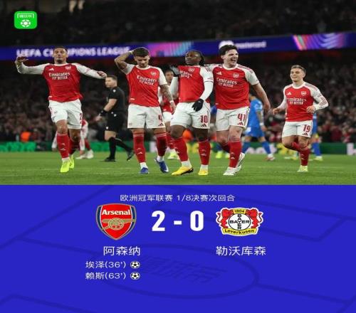 北京時間3月18日歐洲冠軍聯(lián)賽 1/8決賽次回合,阿森納對陣勒沃庫森。上半場埃澤破門,特羅薩德屢次打門造險,下半場賴斯擴大比分,拉亞救險。最終比分阿森納 2-0 勒沃庫森。兩回合總比分阿森納3-1勒沃庫森。