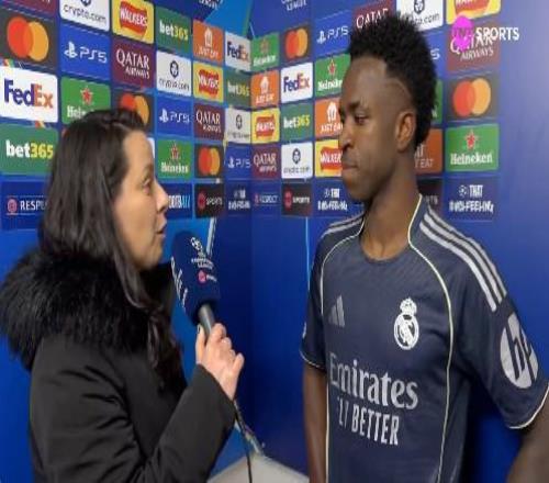 歐冠1/8決賽次回合,皇馬客場(chǎng)2-1戰(zhàn)勝曼城,維尼修斯賽后接受了TNT體育巴西頻道的采訪。