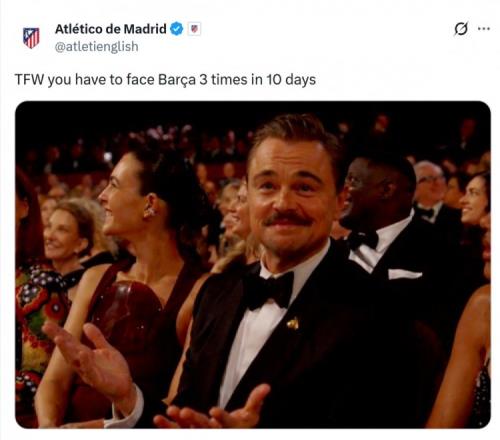 這意味著馬競將在10天內(nèi)3次對陣巴薩,馬競官方社媒曬出萊昂納多·迪卡普里奧在奧斯卡頒獎(jiǎng)典禮上一臉無奈的照片,配文:“當(dāng)你不得不在10天內(nèi)3次對陣巴薩時(shí)的感受?!?/p>