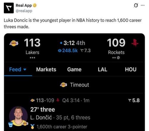 憑借這樣的表現(xiàn),27歲19天的東契奇迎來1600記三分里程碑,創(chuàng)造NBA歷史最年輕紀錄。