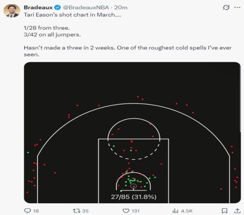 他曬出伊森三月份的投籃熱區(qū)(美國時間),三分球28中1(3.5%),跳投42中3(7.14%),伊森已經(jīng)超過兩周沒有投進(jìn)過三分,這是我見過最寒冷的投籃熱區(qū)圖。