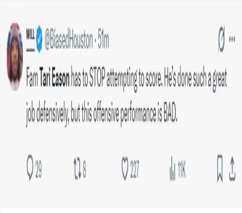 火箭記者Bradeaux:求求烏度卡,讓塔里-伊科回替補席去吧。