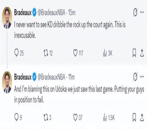 火箭記者Bradeaux已經(jīng)忍無可忍了,他寫道:我要把現(xiàn)在的困境完全歸結(jié)于烏度卡,這就跟上一場一模一樣,他把隊(duì)員們置于失敗的境地,我再也不想看到杜蘭特運(yùn)球到前場了,這簡直不可原諒。