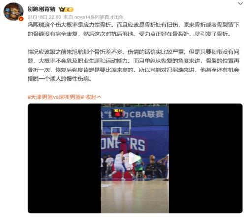 這是馮熙瑞的CBA生涯第二場比賽,他上一場比賽里面對廣州龍獅男籃表現不俗,打了14分鐘,貢獻2分2籃板1助攻1封蓋,給了球隊很大的幫助,被深圳男籃的球迷所喜愛。沒想到,在第二場比賽里,這個冉冉升起的新星就遭遇這樣的傷病。