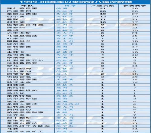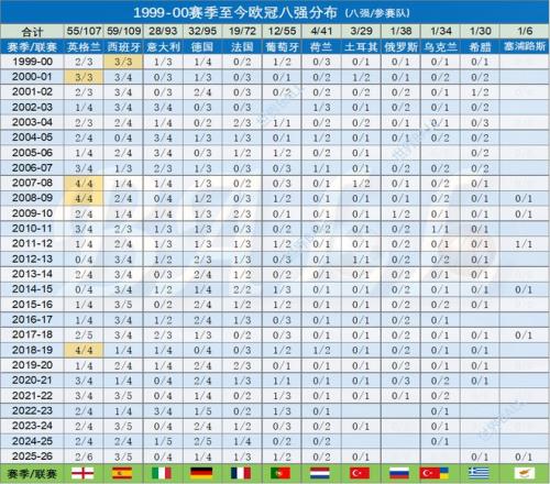 2、金黃色標注的數(shù)據(jù),表示一國出征歐冠小組賽(聯(lián)賽)球隊數(shù)量不低于3支,且全部晉級八強的情況。