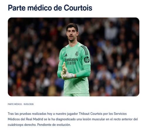 《阿斯報》指出,原本以為,庫爾圖瓦只是肌肉負(fù)荷問題,缺席周日的西甲馬德里德比。不過,庫爾圖瓦的傷情比想象中嚴(yán)重,他需要6周時間養(yǎng)傷。從賽程來看,庫爾圖瓦至少缺席皇馬未來8場比賽: