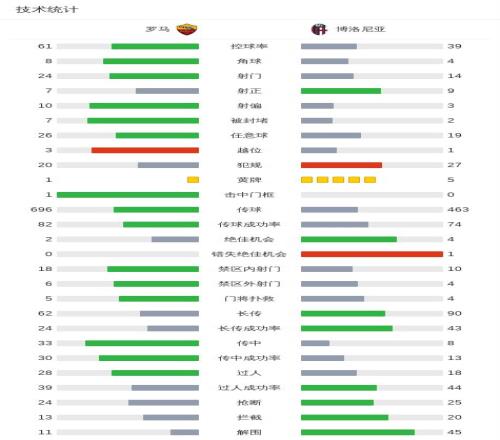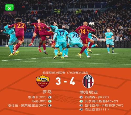 北京時(shí)間3月20日歐足聯(lián)歐洲聯(lián)賽 1/8決賽次回合,羅馬對陣博洛尼亞。上半場羅首開記錄,隨后恩迪卡破門扳平,貝爾納代斯基點(diǎn)射破門領(lǐng)先,下半場卡斯特羅破門擴(kuò)大比分,馬倫點(diǎn)射破門佩萊格里尼破門扳平比分。加時(shí)賽坎比亞吉破門制勝。最終比分羅馬 3-4 博洛尼亞。兩回合總比分羅馬4-5博洛尼亞。