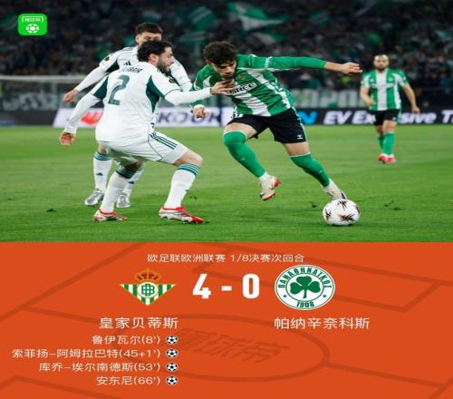 貝蒂斯兩回合41帕納辛奈科斯晉級(jí),魯伊瓦爾傳射,安東尼破門