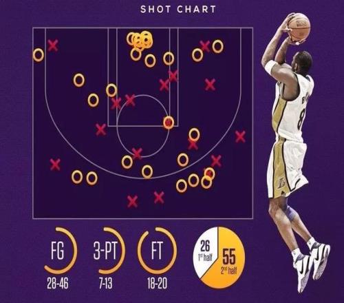 當時恐怕所有的人都沒有想到,半場“僅”拿到26分的科比,會在隨后的比賽中迎來NBA繼邁克爾-喬丹之后最偉大的個人進攻表演,這場普普通通的常規(guī)賽也因為科比而成為經(jīng)典,從而被后人銘記。