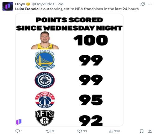 數(shù)據(jù)媒體曬出過去24小時東契奇合計拿到100分,他已經(jīng)比勇士99分、快船99分、奇才95分、籃網(wǎng)92分更多,一支球隊都不如東契奇24小時內(nèi)拿下的分數(shù)多。