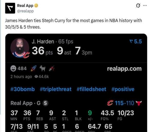 最后本場是哈登生涯第105場砍下至少30分5板5助+5三分,成功追平庫里并列歷史第一。