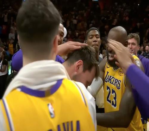 東契奇走上罰球線,第一罰遺憾偏出,湖人替補席全都一臉遺憾,而詹姆斯這邊也是十分緊張,雙手拉著球衣。好在東契奇調(diào)整之后,第二罰穩(wěn)穩(wěn)命中,隨后詹姆斯也是高舉雙手慶祝,隨著比賽時間走完,湖人全隊都上來將東契奇圍著,為他歡呼,詹姆斯也是十分開心,對著他怒吼著,然后和隊友一同圍著他跳圈圈。