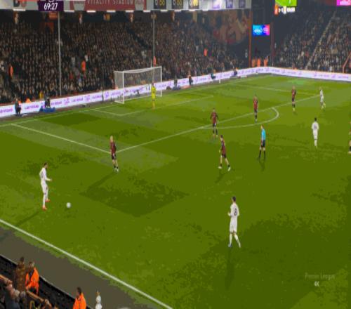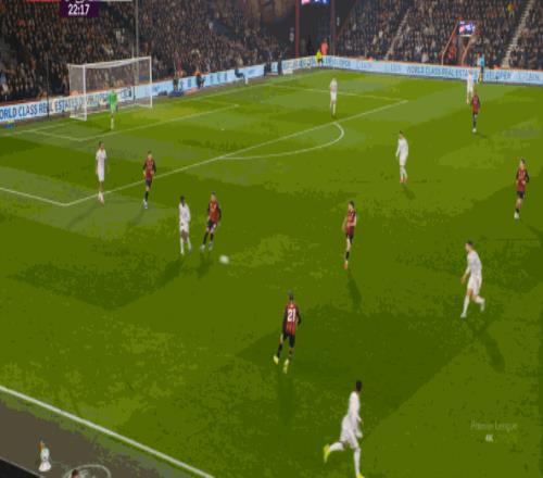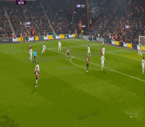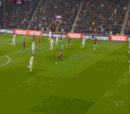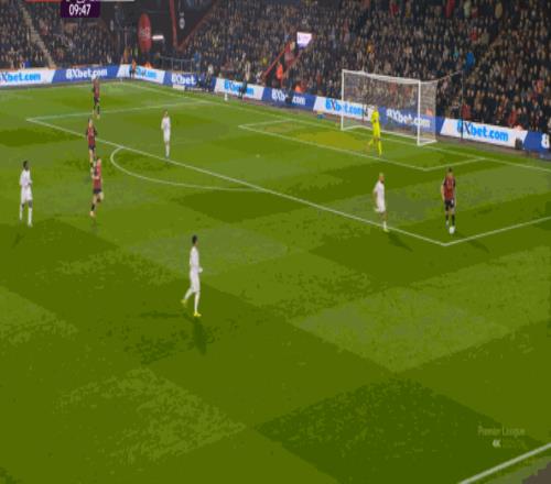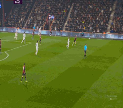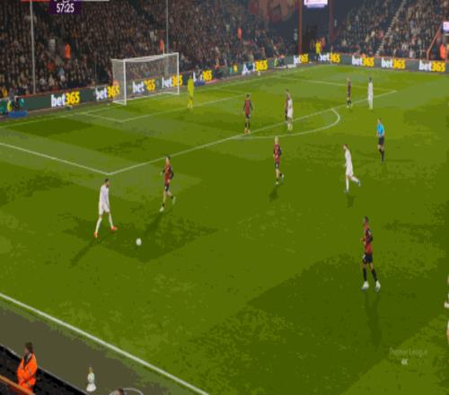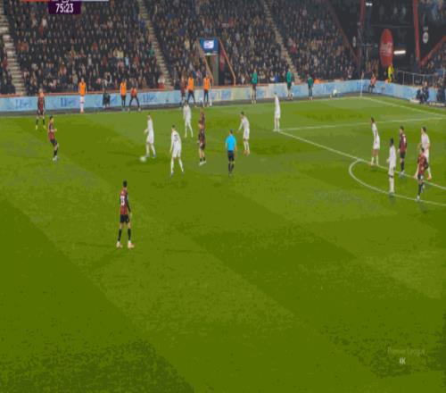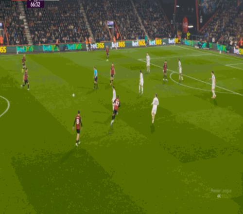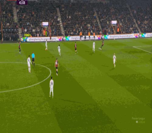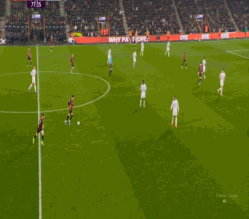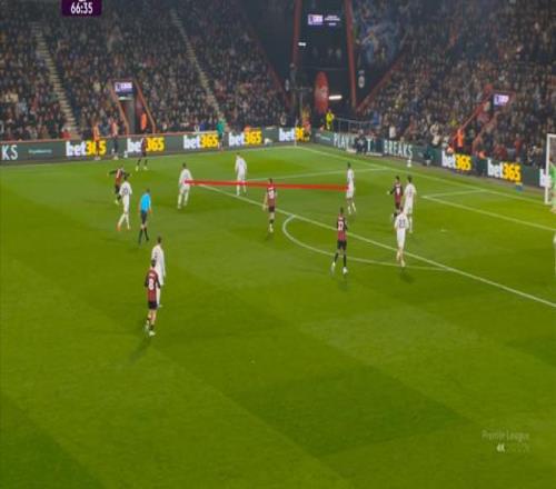 于是在這次轉(zhuǎn)換中,伯恩茅斯擊穿曼聯(lián)的中路,隨后從左路送上傳中: