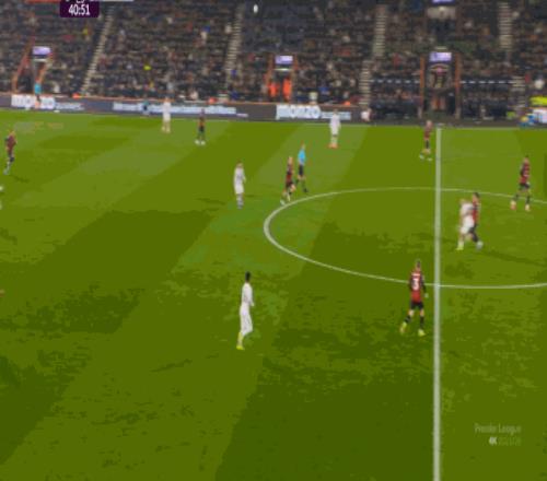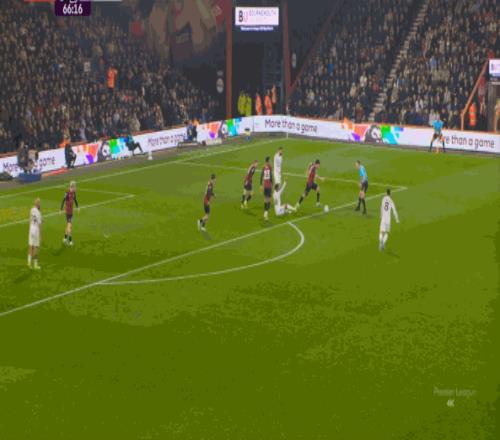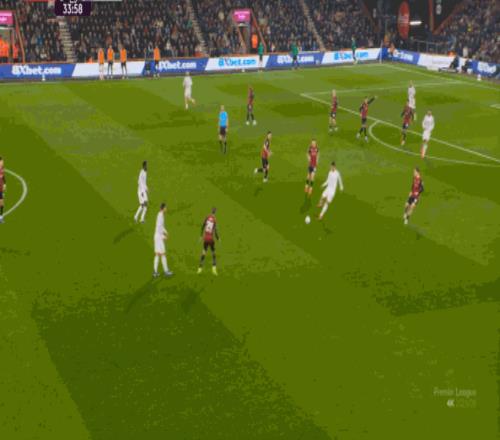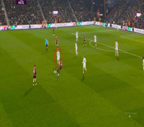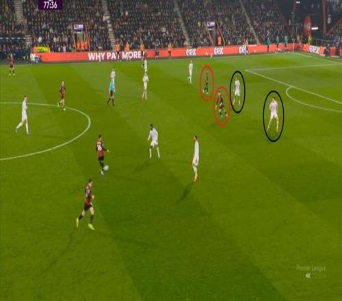 如果布魯諾一直保持拉揚接球時的站位,他是可以堵住橫移線路,從而降低伯恩茅斯進攻效率的: