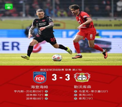 北京時(shí)間3月21日德國足球頂級(jí)聯(lián)賽 第27輪,海登海姆主場(chǎng)對(duì)陣?yán)瘴謳焐I习雸?chǎng)蒂爾曼首開記錄,隨后??似崎T擴(kuò)大比分,下半場(chǎng)貝倫斯、派林格破門扳平比分,希克頭球破門梅開二度將比分超出,派林格在角球進(jìn)攻中頭球破門再度扳平比分。最終比分海登海姆 3-3 勒沃庫森。