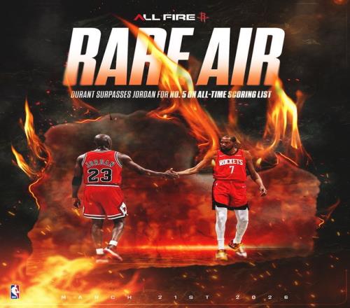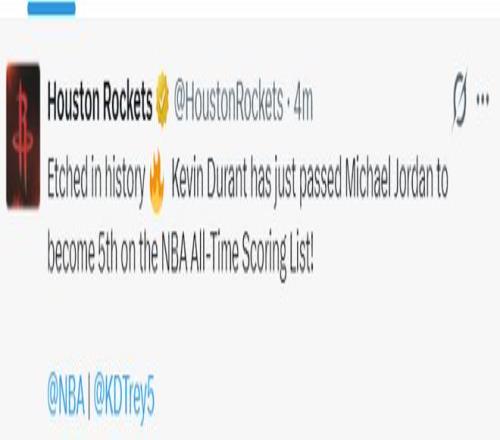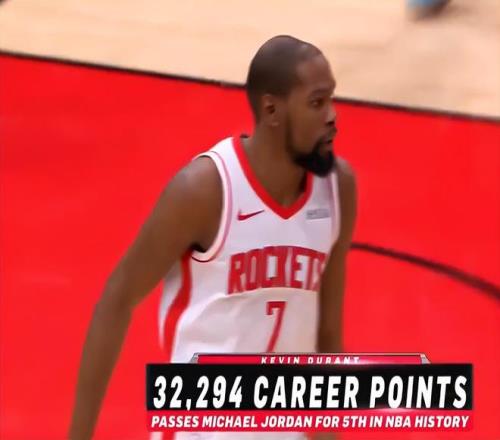 火箭官方:銘刻于歷史之中的杜蘭特,他剛剛在總得分上超越喬丹成為NBA歷史得分榜排名第五的球員。