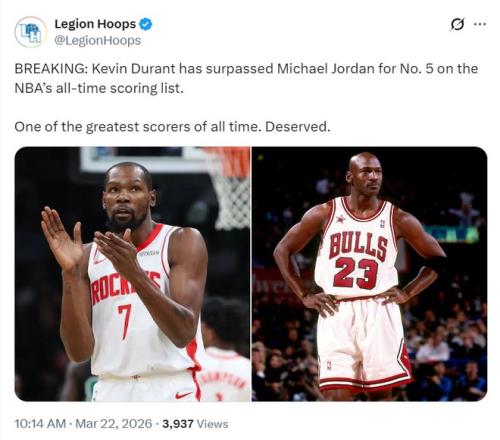 美媒LH寫道:杜蘭特總得分正式超越邁克爾-喬丹升至NBA歷史得分榜第五位。他是有史以來最出色的得分手之一!當(dāng)之無愧。