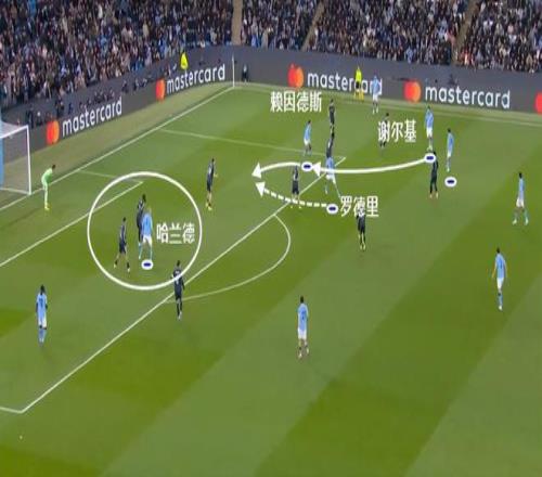 利用哈蘭德牽制對方的后衛(wèi),曼城找到了肋部的進攻空間。謝爾基作為傳球起點,賴因德斯前插肋部做球,帶來羅德里的前插。