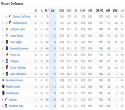 目前西部排名,1-6:雷霆、馬刺(前二鎖定季后賽)、湖人、火箭、掘金、森林狼;