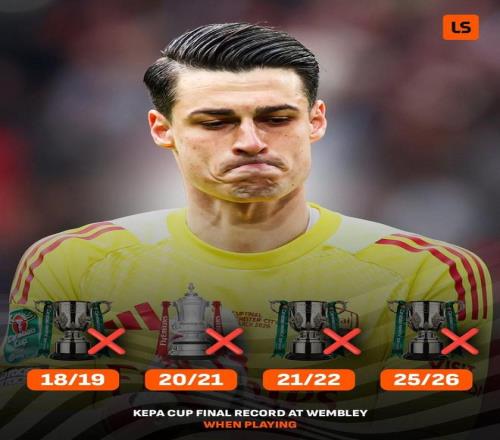 至此,凱帕職業(yè)生涯在溫布利4次出戰(zhàn)杯賽決賽全部失利,分別是2018-19賽季英聯(lián)杯(切爾西)、2020-21賽季足總杯(切爾西)、2021-22賽季英聯(lián)杯(切爾西)和2025-26賽季英聯(lián)杯(阿森納)。