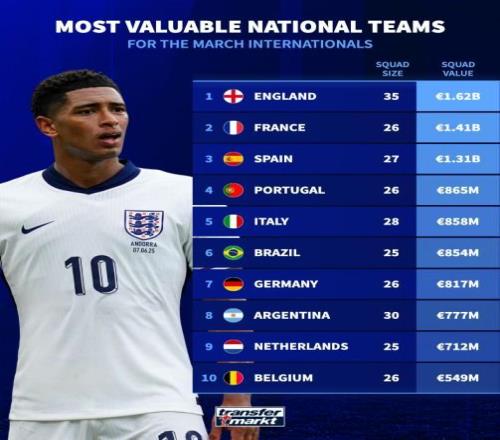 3月國(guó)際比賽國(guó)家隊(duì)身價(jià)榜:英格蘭16.2億第1,阿根廷7.77億第8