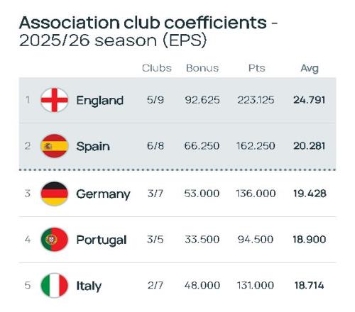 回到前面提及的,EPS排名前兩位的聯(lián)賽,獲得的是多一個(gè)歐冠參賽名額,英超本有四個(gè)名額,第五名維拉靠歐聯(lián)杯奪冠進(jìn)了歐冠,第六名利物浦歐冠奪冠參與歐冠,增加的一個(gè)名額就會(huì)順延給英超第七名。