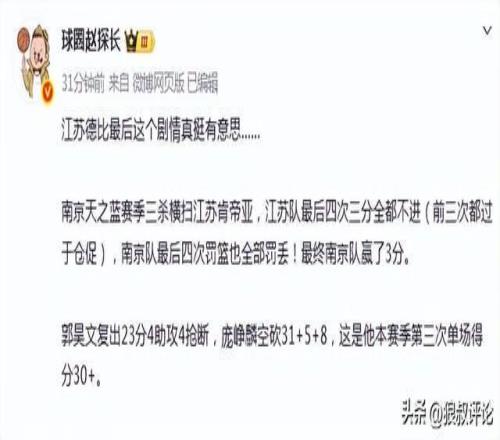 南京天之藍賽季三殺橫掃江蘇肯帝亞,江蘇隊最后四次三分全都不進(前三次都過于倉促),南京隊最后四次罰籃也全部罰丟!最終南京隊贏了3分。