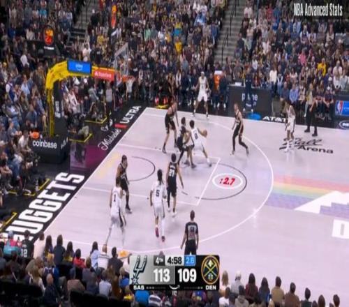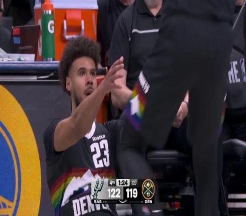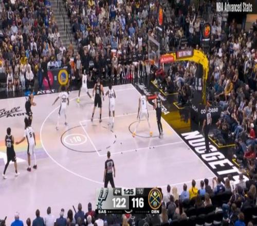 ——第四節(jié)剩下1分24秒前,掘金116-122落后馬刺6分,卡梅倫約翰遜接約基奇?zhèn)髑颍哆M三分并且造成??怂狗敢?guī)。