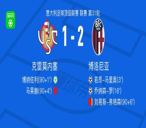 北京時(shí)間4月5日意大利足球甲級(jí)聯(lián)賽第31輪,克雷莫內(nèi)塞主場(chǎng)迎戰(zhàn)博洛尼亞。比賽中,博洛尼亞率先打破僵局,隨后再入一球取得領(lǐng)先;下半場(chǎng)補(bǔ)時(shí)階段,克雷莫內(nèi)塞通過點(diǎn)球扳回一城,但之后克雷莫內(nèi)塞與博洛尼亞各有一名球員被罰下。最終比分定格為克雷莫內(nèi)塞1-2博洛尼亞。
